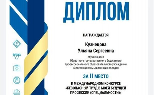 Мы гордимся тем, что студентка Северского промышленного колледжа Кузнецова Ульяна Сергеевна заняла 2 место в номинации научно-исследовательская работа «Безопасность и охрана труда».